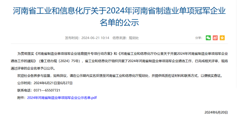 6月21日,河南省工业和信息化厅发布了《关于2024年河南省制造业单项冠军企业名单的公示》,郑州开云官方网页版官网科技实业股份有限公司荣登榜单。