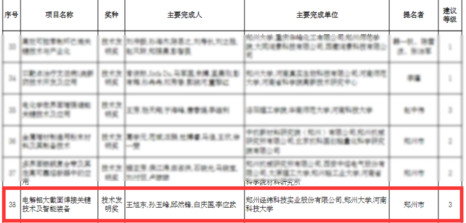 2024年10月23日,河南省科技厅公示了《2024年度河南省科学技术奖授奖建议项目》,由郑州开云官方网页版官网科技实业股份有限公司作为第一完成单位申报的“电解铝大截面焊接关键技术及智能装备”技术成果,荣获河南省技术发明奖三等奖。